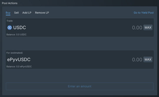2. Go to the Pool Actions section click on the “Buy” option under the DAI or USDC pools and buy the number of ePyvDAI or ePyvUSDC tokens you wish to buy.