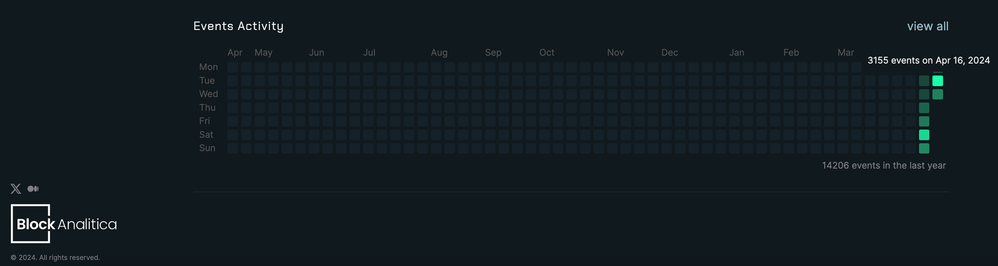 The Events Activity data visualization is a heat map of sorts showing the intensity of activity for each day. Hover over each green/active square to see how many events (i.e. protocol interactions) there were on any given day.