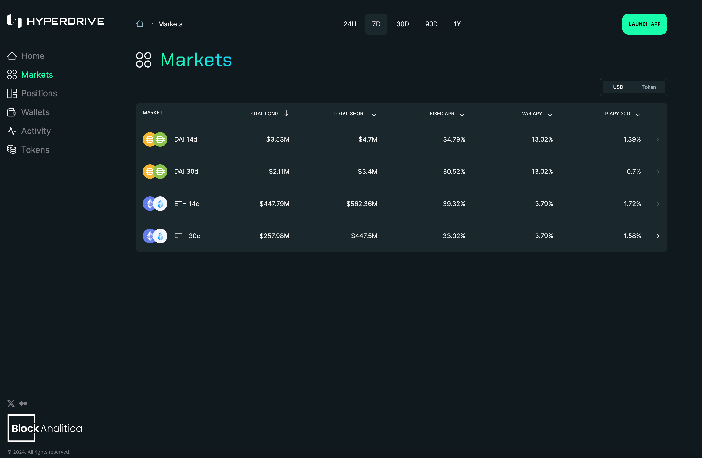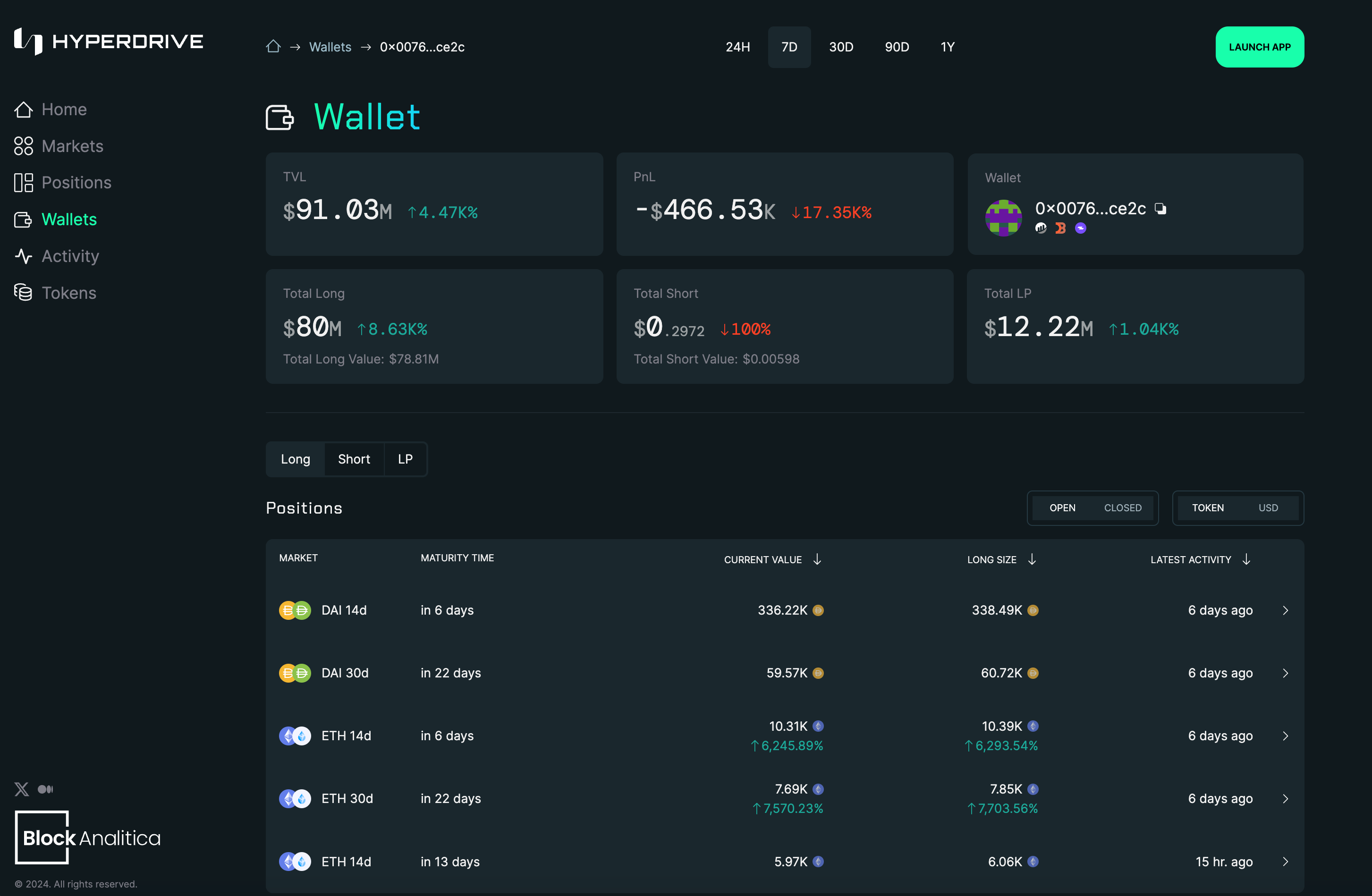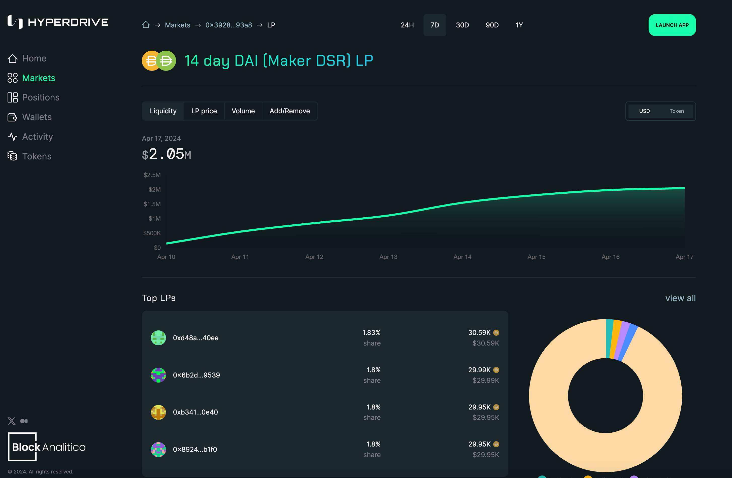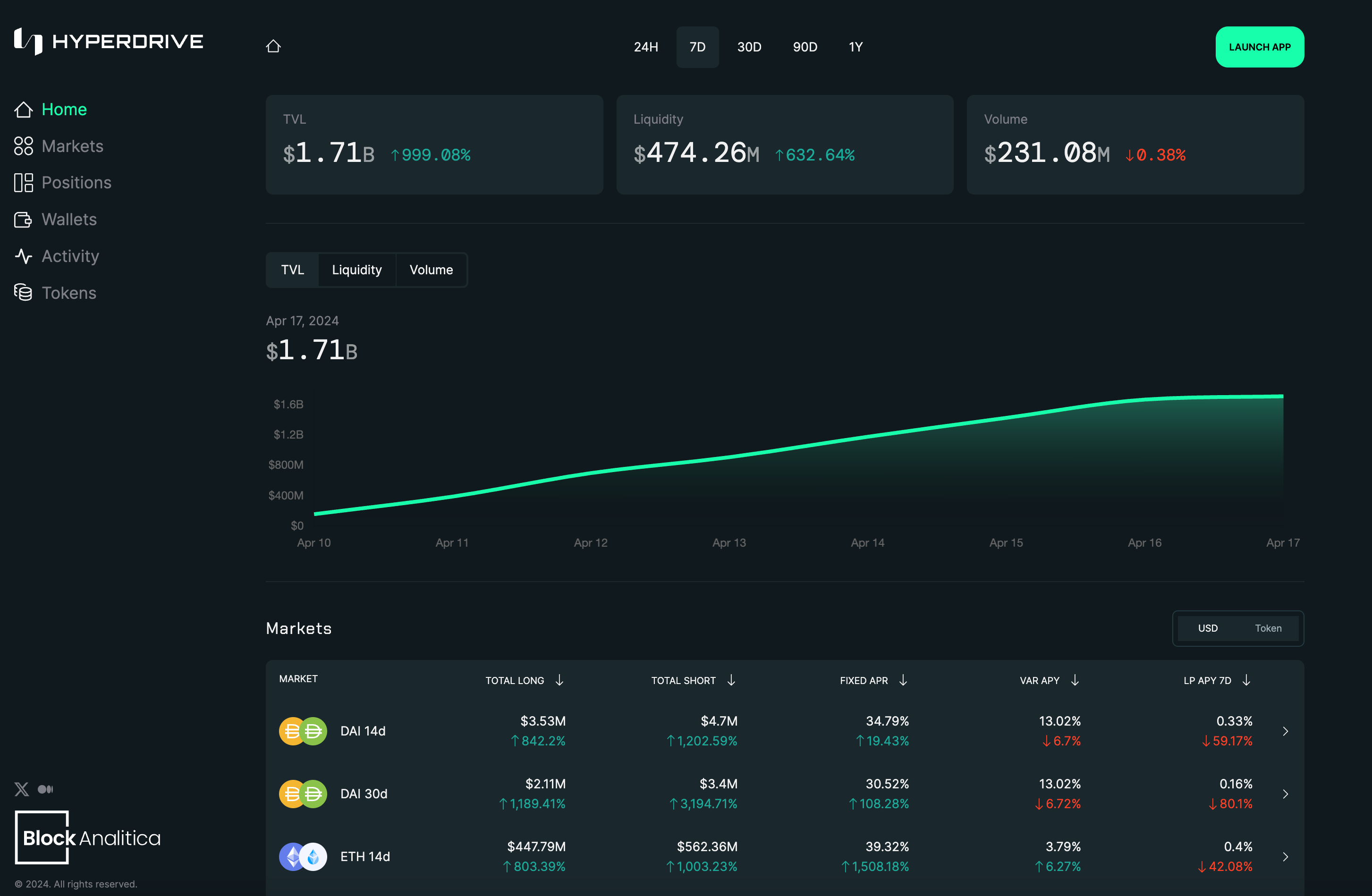 The Hyperdrive Analytics dashboard is a companion dashboard to the Hyperdrive app, enabling anyone to delv deeper into key data insights stemming from the trading activity on the underlying protocol. Monitor risk metrics, uncover growth opportunities, and hypercharge your potential portfolio performance by gleaning new insights into market dynamics. Analytics are presented at the protocol, market, and individual wallet levels!