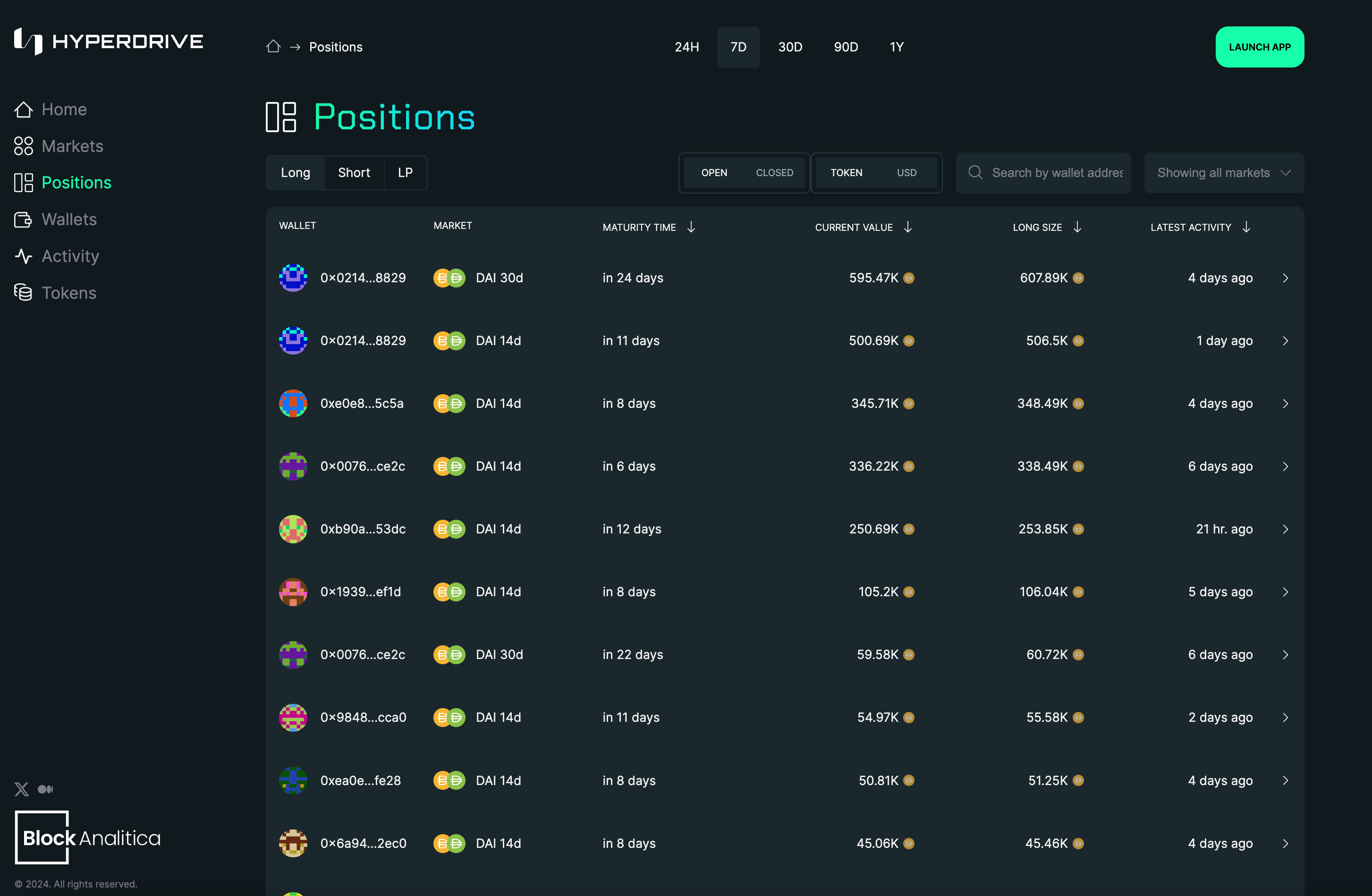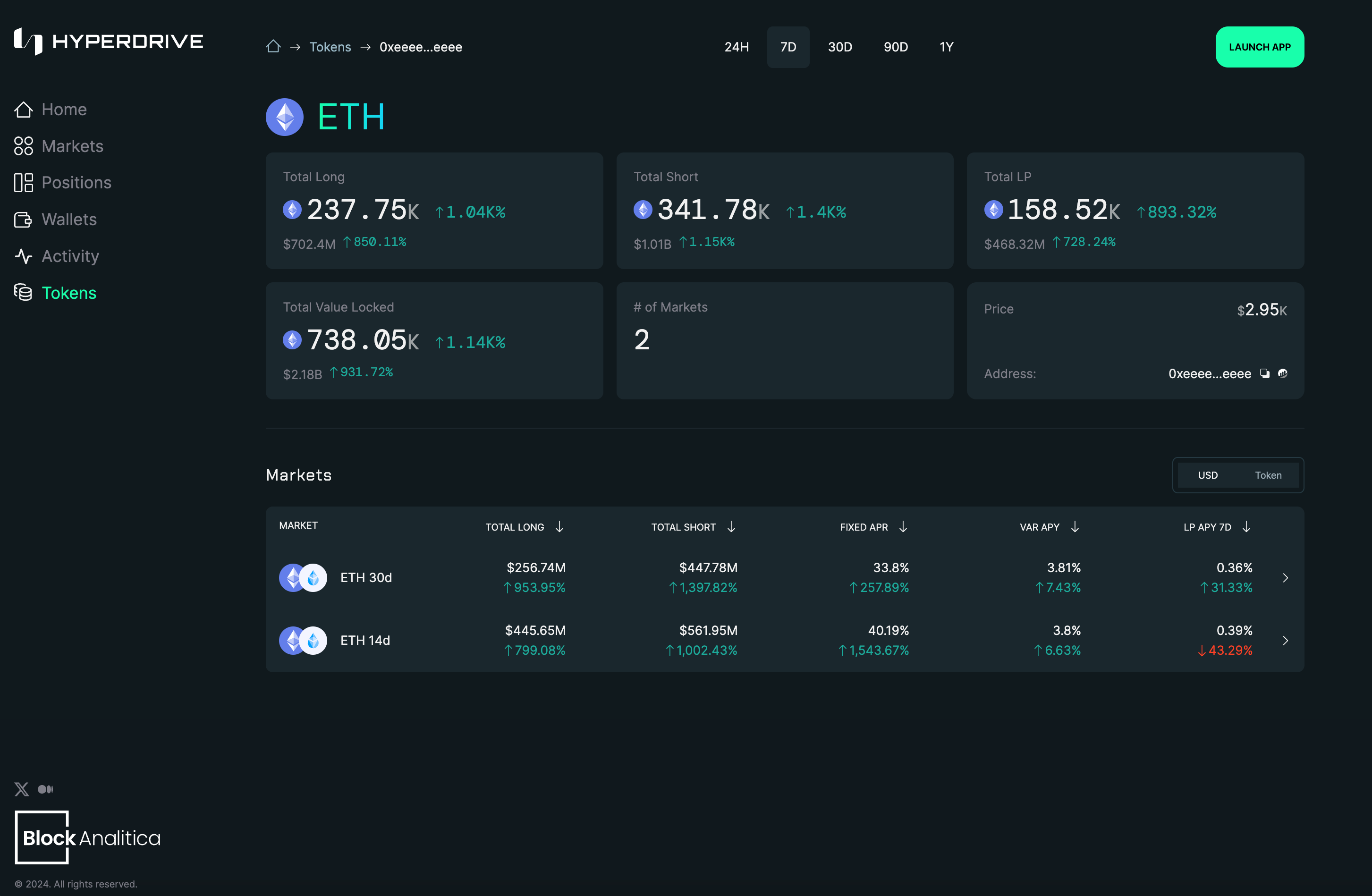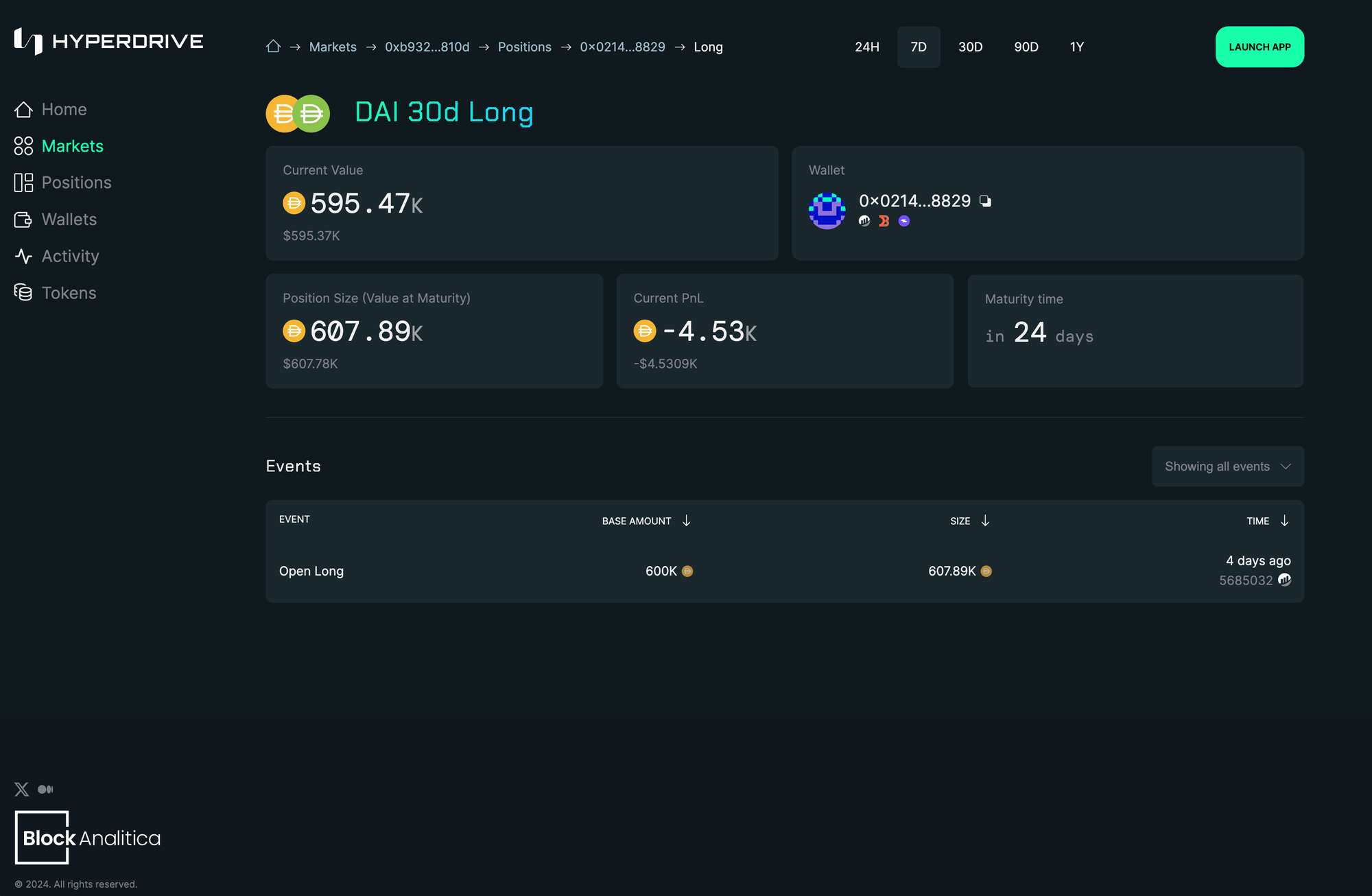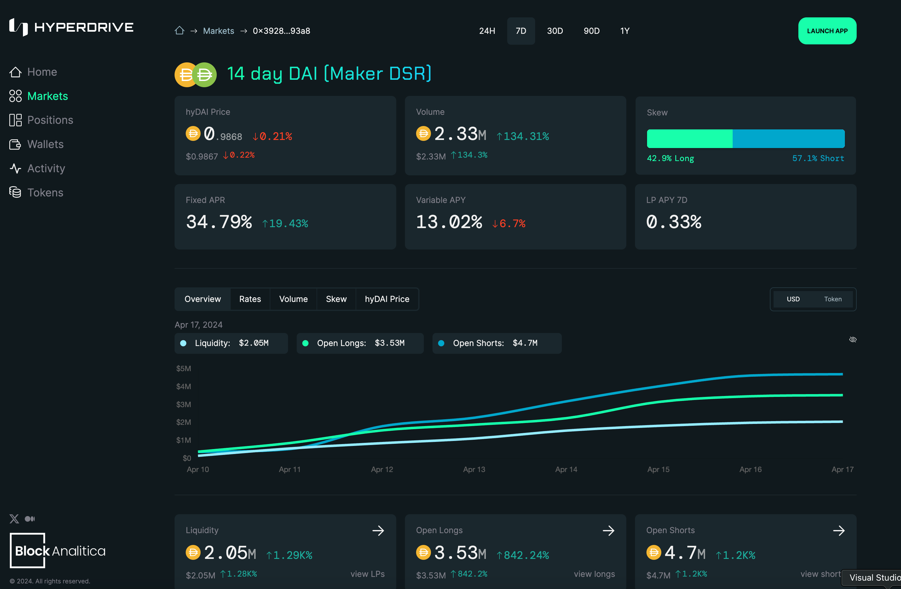 The Hyperdrive Analytics dashboard is a companion dashboard to the Hyperdrive app, enabling anyone to delv deeper into key data insights stemming from the trading activity on the underlying protocol. Monitor risk metrics, uncover growth opportunities, and hypercharge your potential portfolio performance by gleaning new insights into market dynamics. Analytics are presented at the protocol, market, and individual wallet levels!