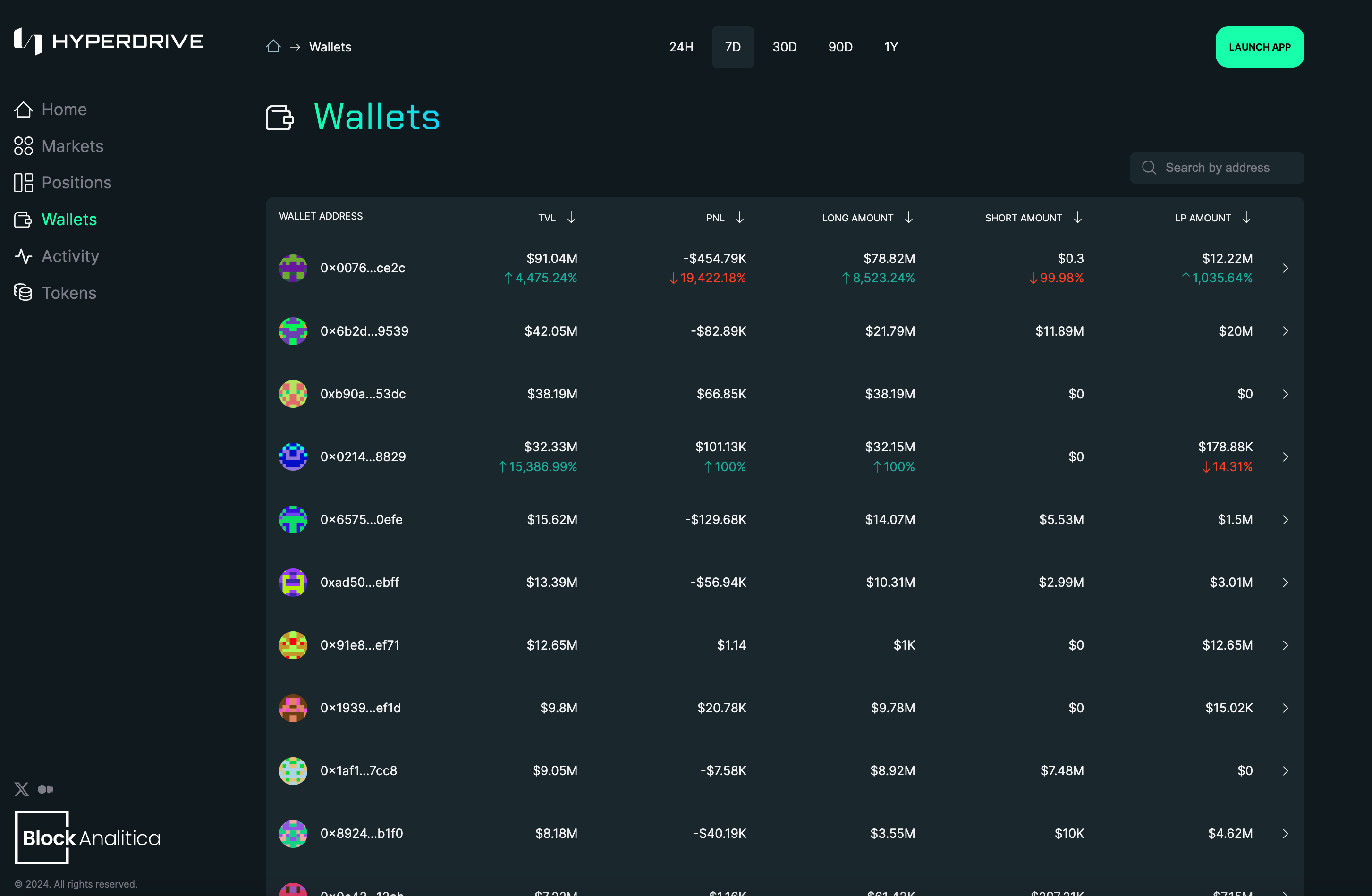 On the Wallets page you’ll be able to track which user wallets are TVL heavy-weights and uncover alpha by identifying those that are highest performing. Which markets are they active in? What trading strategies do they appear to be employing?